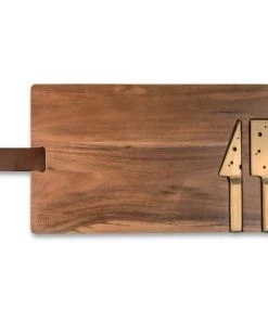 2 couteaux en méat façon gruyère maintenu sur la planche en bois par des magnets, le tout pouvant être suspendu avec la sangle en cuir. Très qualitatif et idéal pour un cadeau pour couple. Dimensions : 37 x 23 x 4cm Matière : cuir, métal inox et bois Contient : 1 planche, 2 couteaux et 1 attache