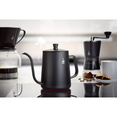 Le col de cygne de la bouilloire et l’ouverture pour thermomètre à tige intégrée dans le couvercle permettent une préparation optimale de délicieuses boissons chaudes, que ce soit pour l’arôme et le goût qui explosent littéralement lors de la préparation d’un café ou pour une tasse de thé à la parfaite température. Sa surface noire et mate et son élégant design attirent le regard dans toutes les cuisines.- Bec verseur pointu- Ouverture intégrée dans le couvercle pour le thermomètre à tige- Contenance : 500 ml- Graduation intérieur avec capacité de remplissage max. : 375 ml (jusqu’à 3 tasses de 125 ml)- Poignée ergonomique- Adapté aux cuisinières électriques, aux plaques vitrocéramiques et à induction (selon le diamètre moyen de la détection du récipient)Garantie : 5 ans