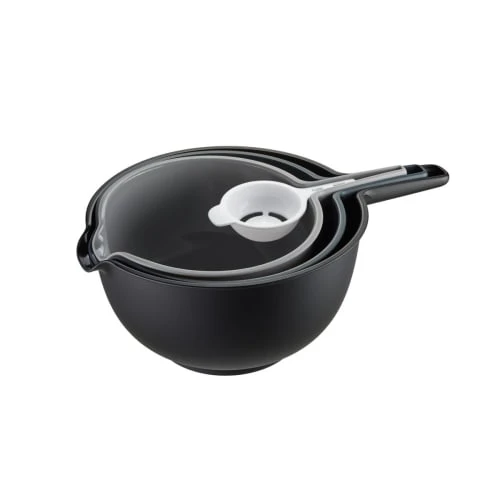 Vite à portée de main, vite rangés : cette petite merveille peu encombrante de 4 pièces se glisse dans n’importe quelle armoire de cuisine et veille à ce que l’ordre y règne. Les éléments à multiples utilisations se composent de deux grands saladiers, d’une passoire et d’un séparateur de jaune d’?uf pratique.- S’insèrent l’un dans l’autre pour un rangement peu encombrant- Contenu du lot :- Séparateur de jaune d’?uf avec support pratique- Passoire- Saladier : 1 800 ml- Saladier avec pieds antidérapants : 4 000 ml- Poignées et becs verseurs pratiques- Résistant àla chaleur jusqu?à 100 °CGarantie : 5 ans