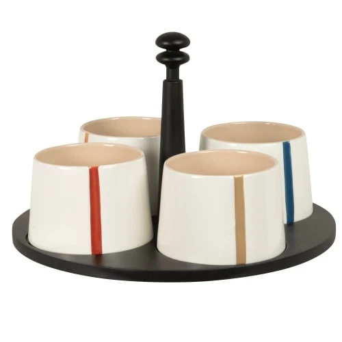 Maisons Du Monde Coupelles Apéritives En Grès Blanc Motifs Multicolores (x4) Plateau En Bois D’hévéa Noir