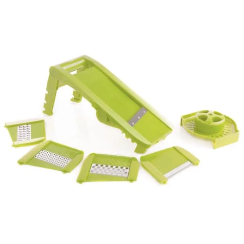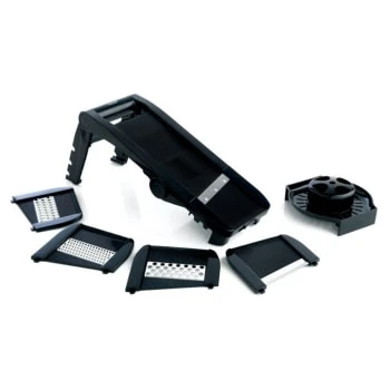 Lames et râpes clipsées/bloquées sur la base, garde, large poignée, pied antidérapant, fixation possible sur un bol de préparation de 12 à 22 cm de diamètre : stabilité, sécurité et fonctionnalité sont au rendez-vous.