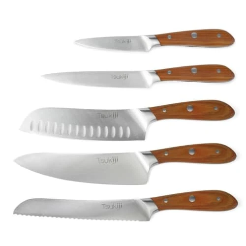 Bloc de 5 couteaux de cuisine de la gamme Tsukiji : couteau d’office, couteau utile, couteau Santoku, couteau à pain et couteau de chef. Manches et bloc naturels en bois de frêne fumé, résistant et durable.Tsukiji incarne une cuisine saine et naturelle. Un design japonais et épuré qui associe un bloc aux formes structurées, à des couteaux aux manches harmonieusement arrondis.Les couteaux de Chef Sabatier Trompette ont été développés pour répondre aux exigences spécifiques de la préparation culinaire. Les lames des couteaux sont en acier inoxydable Molybdène vanadium de grande qualité avec un pourcentage élevé de carbone. Ces aciers confèrent aux produits leurs qualités de résistance, dureté, inoxydabilité, anti-corrosion et tranchant.