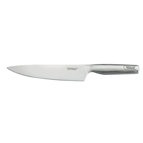Couteau de chef de la gamme Asean. Lame 20cm en acier haute performance MoV – Molybdène Vanadium. Le dos de lame est arrondi, pour un confort de coupe optimal. Le fil de la lame est poli au cuir pour un tranchant rasoir. Couteau monobloc avec manche en acier inox 18/0. Nous recommandons d’essuyer le couteau après lavage – machine ou main – pour en prolonger indéfiniment l’usage.La collection Asean se décline sur 6 modèles d’inspiration japonaise. 100% acier, les couteaux de cuisine Asean ont une résistance à toute épreuve. Faciles à nettoyer, leur fluidité en fait des outils sains, antibactériens, adaptés à un usage quotidien.La marque Sabatier Trompette est née au début du 18ème siècle dans le bassin de Thiers, capitale de la coutellerie en France. Les gammes de couteaux de la marque Sabatier Trompette répondent aux usages spécifiques de la préparation culinaire. Forme de la lame, ergonomie du manche, faible poids et parfait équilibre sont étudiés afin d?obtenir des outils parfaits pour les Chefs amateurs ou confirmés.
