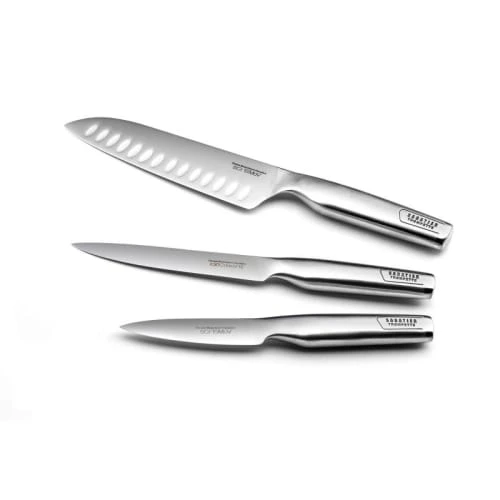 Set de 3 couteaux : Office 9cm, Utile 13cm et Santoku 17cm de la gamme Asean. Lame en acier haute performance MoV – Molybdène Vanadium. Dos de lame arrondi pour un confort de coupe optimal. Le fil de la lame est poli au cuir pour un tranchant rasoir.La collection Asean se décline sur 6 modèles d’inspiration japonaise. 100% acier, les couteaux de cuisine Asean ont une résistance à toute épreuve. Faciles à nettoyer, leur fluidité en fait des outils sains, antibactériens, adaptés à un usage quotidien.La marque Sabatier Trompette est née au début du 18ème siècle dans le bassin de Thiers, capitale de la coutellerie en France. Les gammes de couteaux de la marque Sabatier Trompette répondent aux usages spécifiques de la préparation culinaire. Forme de la lame, ergonomie du manche, faible poids et parfait équilibre sont étudiés afin d’obtenir des outils parfaits pour les Chefs amateurs ou confirmés.