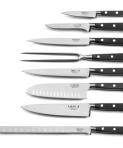 Set de 8 couteaux : Office 10cm, Désosser 13cm, Filet de sole 18cm, Couteau et Fourchette à découper 20cm, Santoku 18cm, Chef 20cm et Jambon/Saumon 28cm de la gamme Origin. Lame en acier haute performance MoV – Molybdène Vanadium. Dos de lame arrondi pour un confort de coupe optimal. Le fil de la lame est poli au cuir pour un tranchant rasoir.La collection Origin est une gamme premium qui couvre toutes les fonctions de la préparation culinaire. Répondant aux exigences des professionnels, les manches ont un dessin traditionnel, avec 3 rivets et une mitre en inox. La lame se prolonge sur toute la longueur pour offrir le maximum de fiabilité et de performance.La marque Sabatier Trompette est née au début du 18ème siècle dans le bassin de Thiers, capitale de la coutellerie en France. Les gammes de couteaux de la marque Sabatier Trompette répondent aux usages spécifiques de la préparation culinaire. Forme de la lame, ergonomie du manche, faible poids et parfait équilibre sont étudiés afin d’obtenir des outils parfaits pour les Chefs amateurs ou confirmés.
