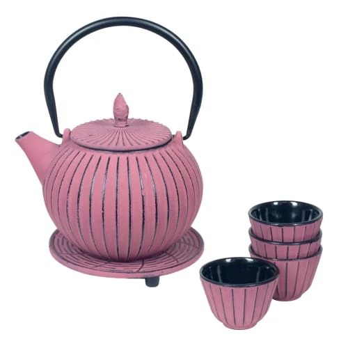Set cadeau Théière Japonaise Rose en fonte Ce set comprend : – Théière Japonaise 0.85 Litre en fonte Émaillée (avec un infuseur) Dimensions avec anse : Hauteur 19.5 cm x Largeur 15.5 cm x Profondeur 13 cm – Dessous de théière en fonte Dimensions : Hauteur 1 cm – Diamètre 13 cm – 4 gobelets assortis Dimensions d’un gobelet : Hauteur 4.5 cm – Diamètre 6.5 cm Avec son intérieur émaillé, cette théière en fonte est destinée à infuser tous vos thés sans garder leurs arômes en mémoire.