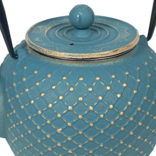 Théière de type japonaise bleue et or en fonte 0.85 litre Fonte Émaillée 0.85 Litre Livrée avec un infuseur Dimensions avec anse : Hauteur 21 cm – Largeur 17 cm – Profondeur 14.5 cm Avec son intérieur émaillé, cette théière en fonte est destinée à infuser tous vos thés sans garder leurs arômes en mémoire. La théière en fonte a pour caractéristique de rouiller. Ne vous inquiétez pas trop de la rouille, en effet la rouille de la théière en fonte n’est pas nocive pour la santé humaine.