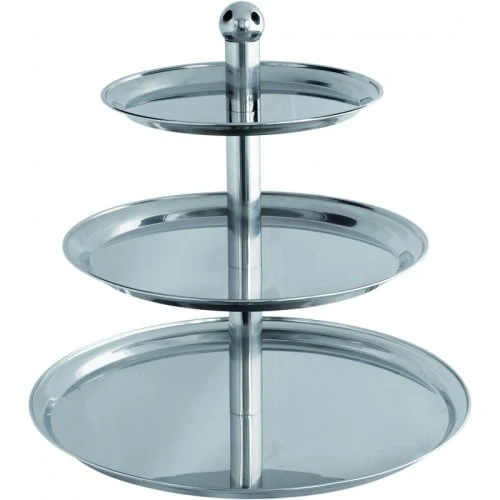 Présentoir à fruits à 3 étages comprenant 3 assiettes avec ourlets. Diamètre des assiettes : 505 mm, 405 mm, 305 mm Espace entre les assiettes : 175 mmHauteur : 500 mm Matériau : acier inoxydable
