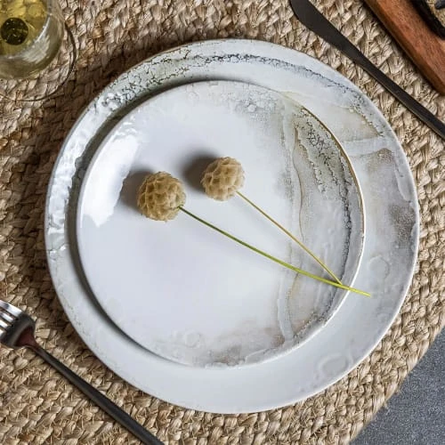 Cette assiette à dessert mojave en grès blanc est décorée. des couleurs chaudes, marron et doré déposées comme des petits grains de sable pour rappeler le désert. (lot de 6)Collection : Mojave Matière : Grès Couleur : Blanc Hauteur : 2.6 cm Diamètre : 21 cmCompatible Lave-vaisselle Compatible Micro-onde