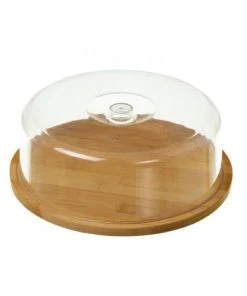 Plateau à fromage rond en bambou et cloche en acrylique transparente.